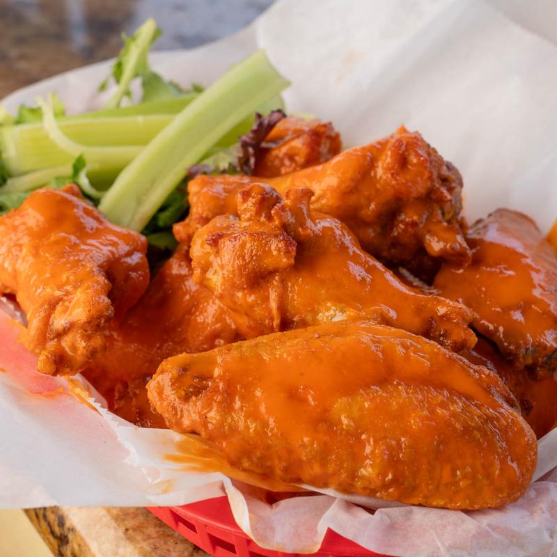 Strips of chicken, fried and then tossed in our house buffalo sauce and wrapped with lettuce and bleu cheese or ranch dressing.